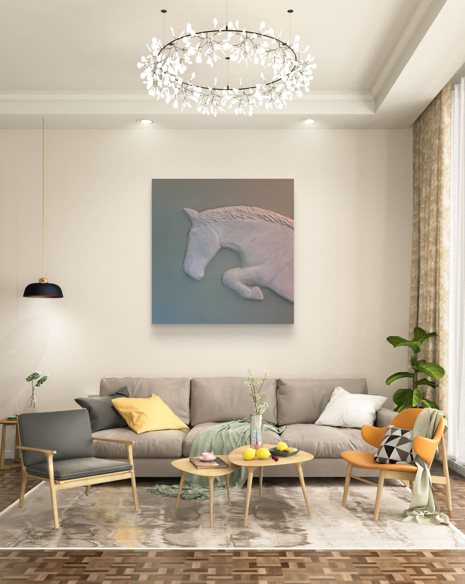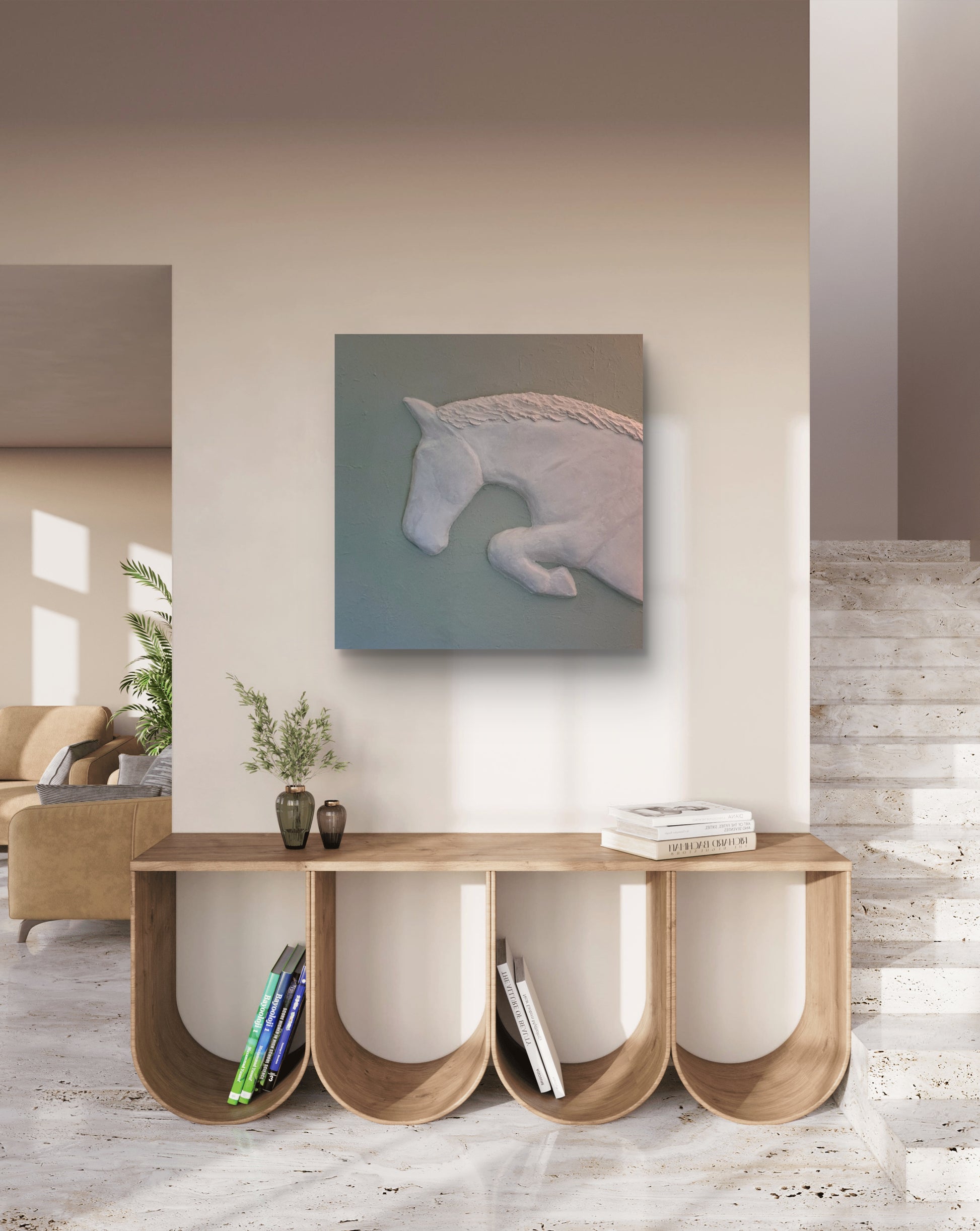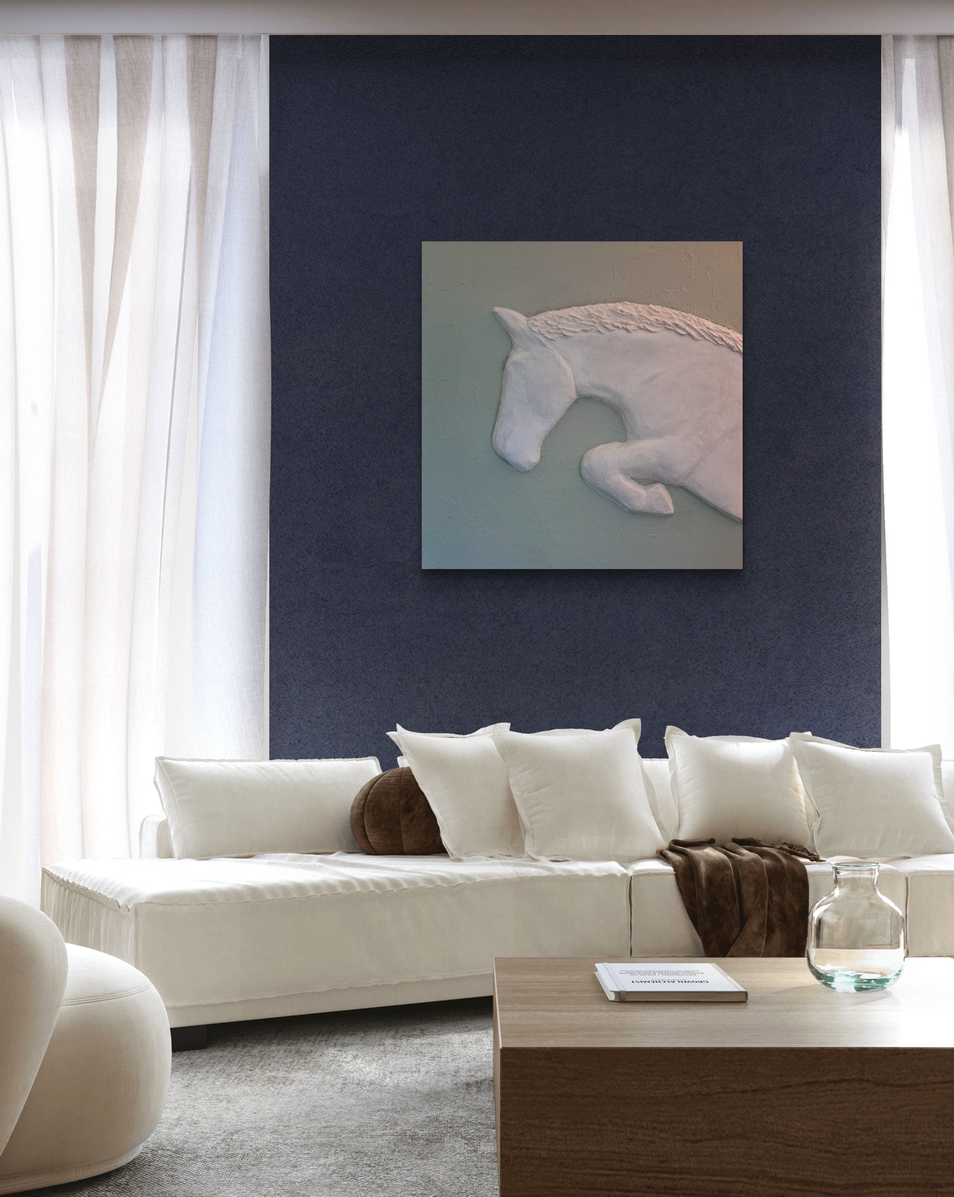 Door de minimalistische vormtaal en het ontbreken van overbodige details ontstaat een hedendaagse rust, terwijl het springende paard symbool staat voor vrijheid, energie en vooruitgang. De voelbare textuur geeft het kunstwerk diepte en nodigt uit tot aandachtig kijken.