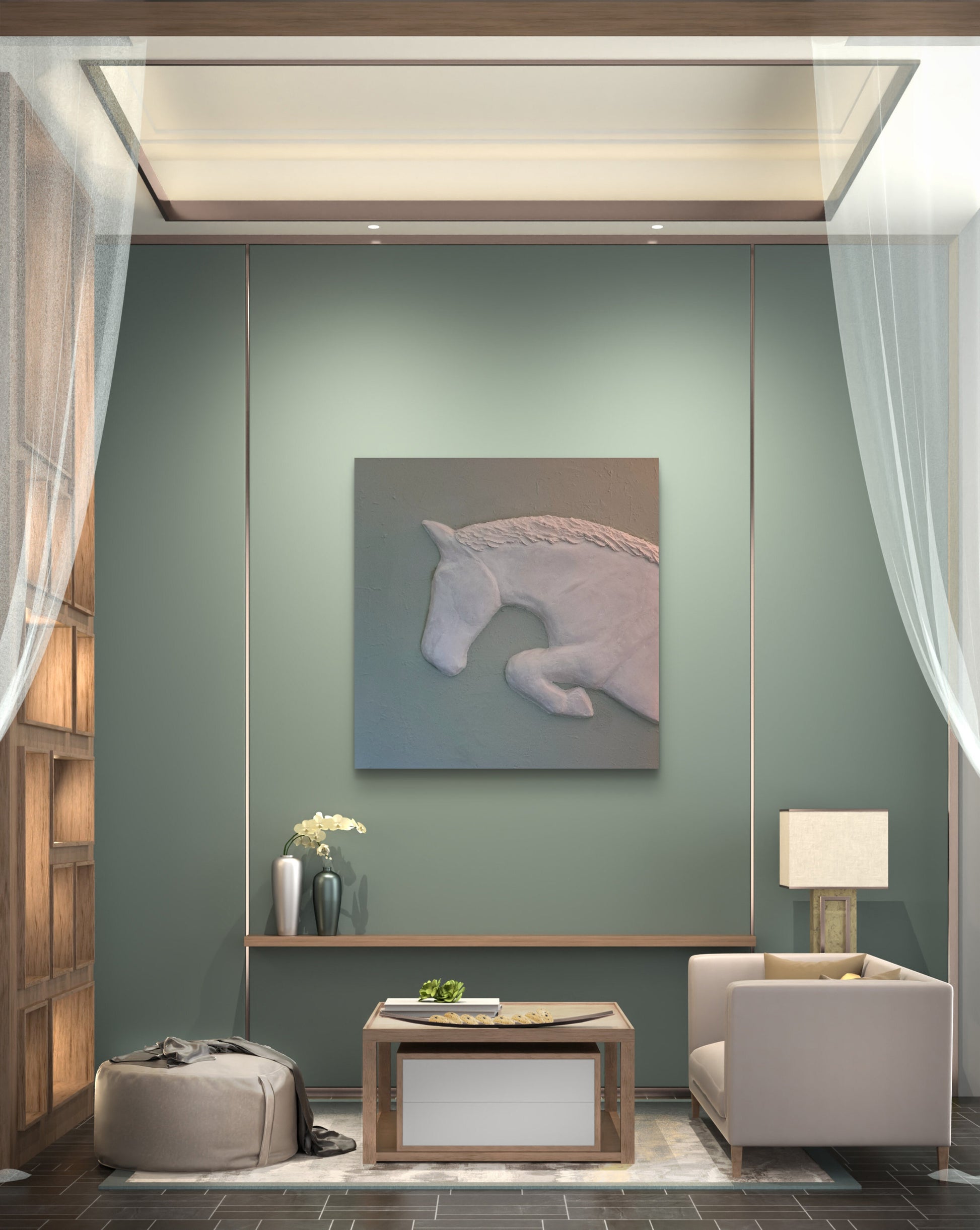 Dit kunstwerk verbeeldt een paard in een krachtige sprong, vastgelegd in een moment van pure beweging en elegantie. In een subtiel reliëf komt de dynamiek van het lichaam naar voren: gespannen spieren, een gebogen hals en een vloeiende lijn die snelheid en controle suggereert. De ingetogen, monochrome tint in zacht saliegroen laat licht en schaduw het oppervlak modelleren en versterkt het sculpturale karakter van het werk.