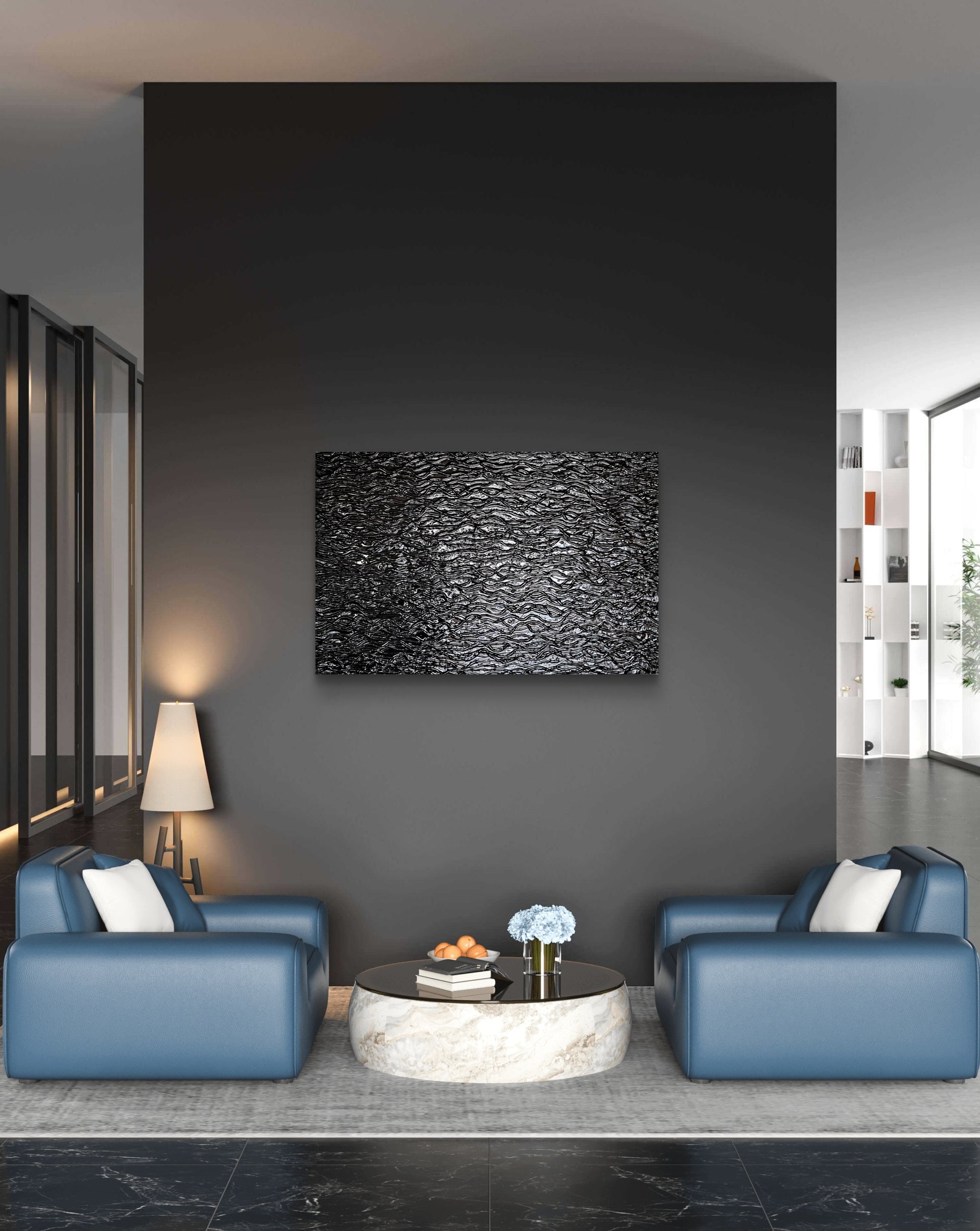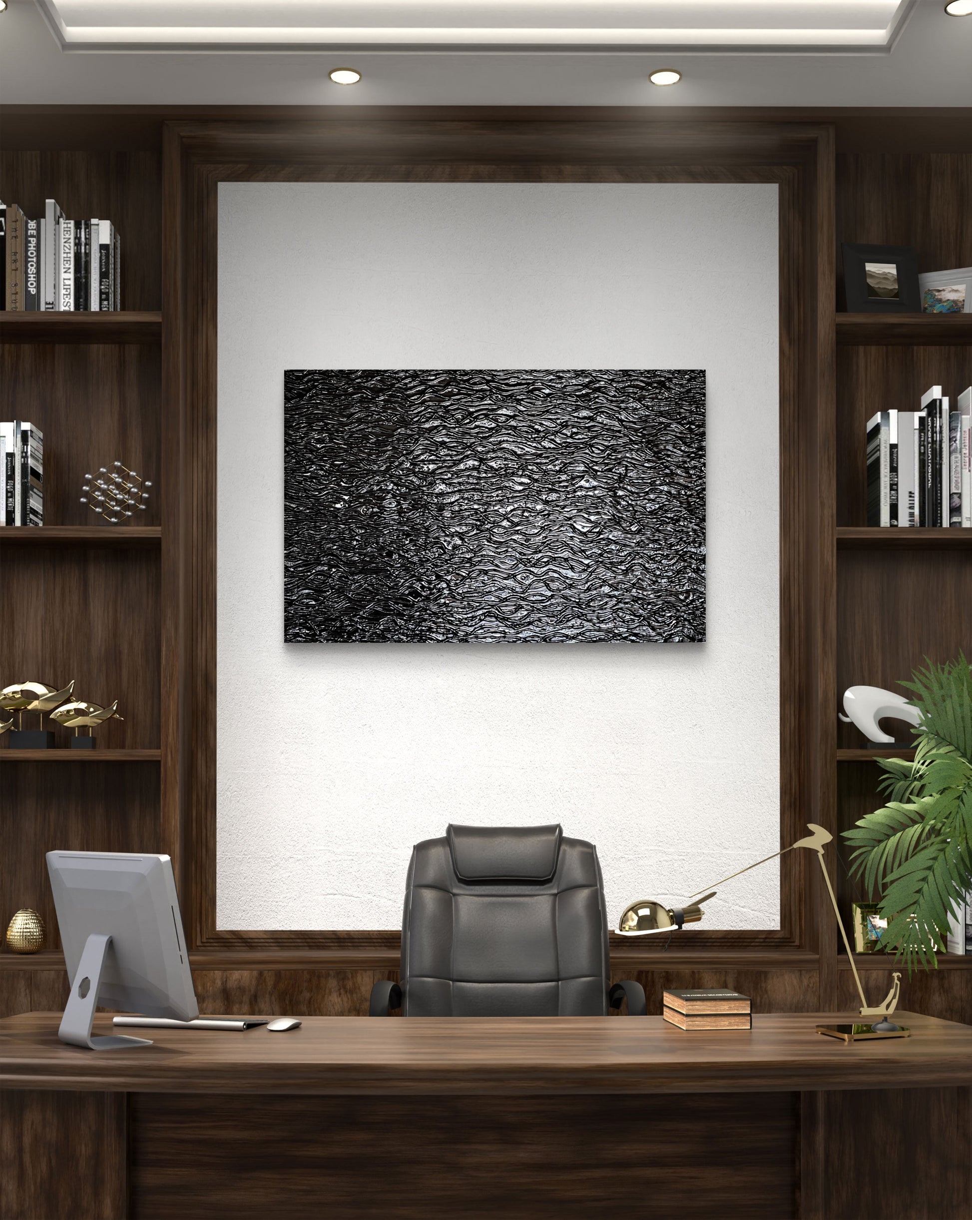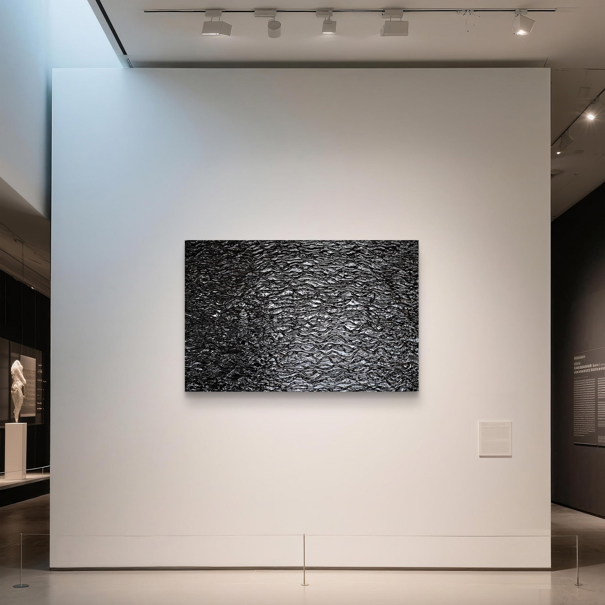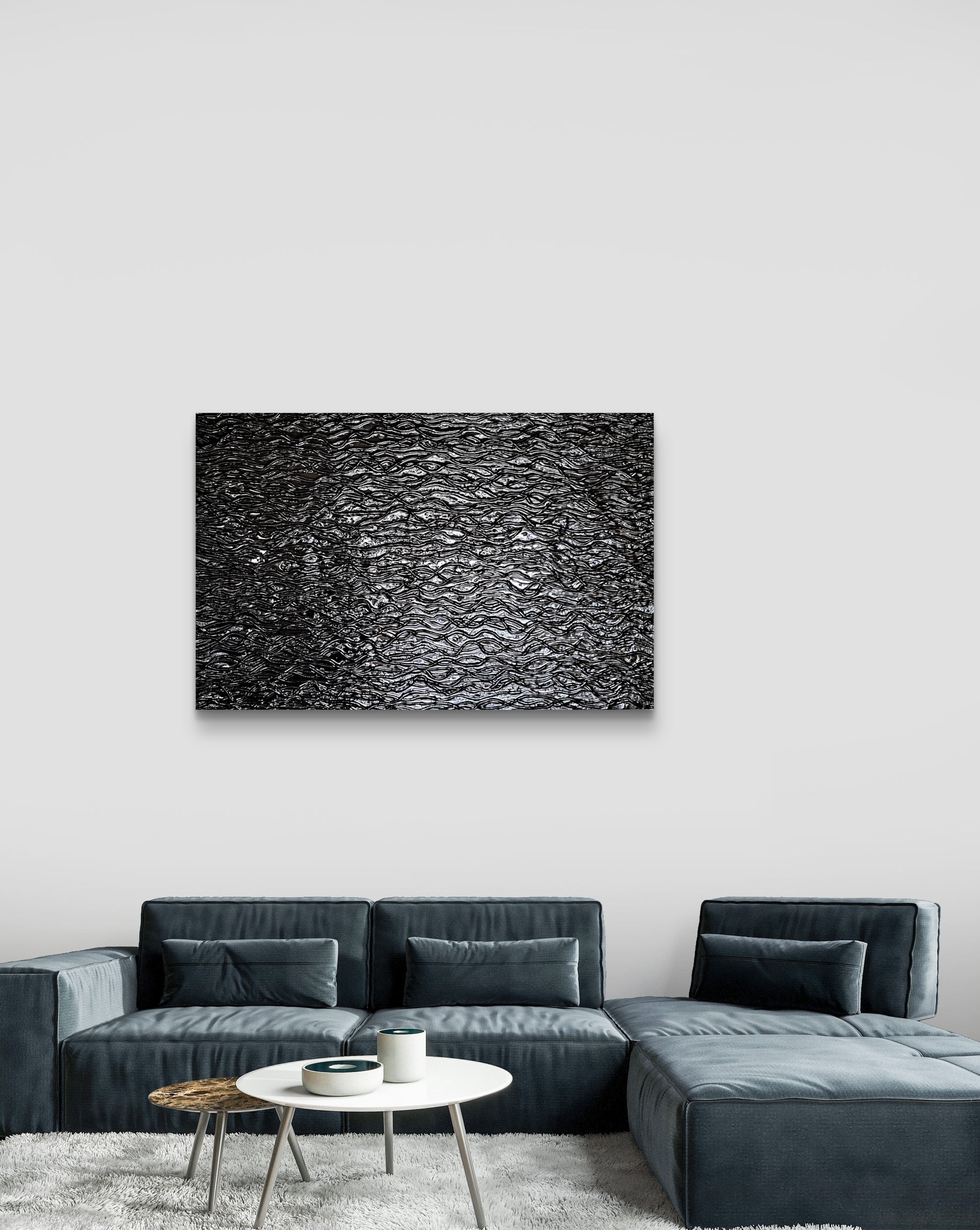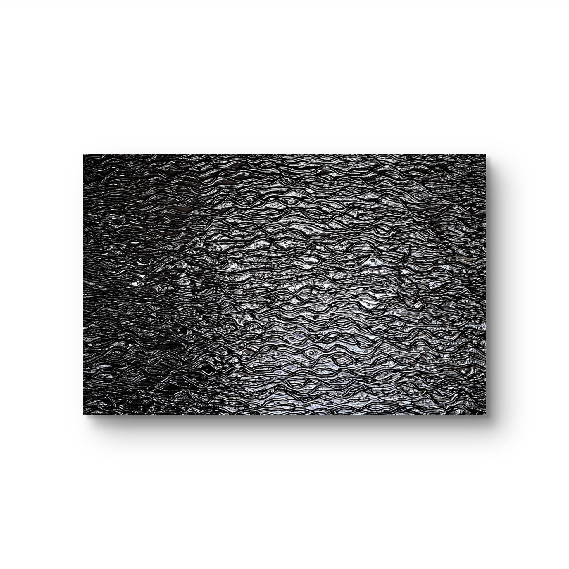 Flux is een abstract werk dat speelt met ritme, diepte en reflectie. Het oppervlak wordt gedomineerd door golvende, organische lijnen die zich herhalen en in elkaar overvloeien, alsof het materiaal zelf in beweging is. De zwarte kleur vormt geen leegte, maar juist een gelaagd landschap waarin licht en schaduw continu met elkaar in dialoog zijn.